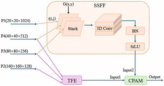 To solve the multiscale problem in UAV aerial images, we introduced the ASF (Attentional Scale Sequence Fusion) structure. ASF [40] primarily consists of the Scale Sequence Feature Fusion (SSFF) module, Triple Feature Encoding (TFE) module and Channel and Position Attention Mechanism (CPAM), as illustrated in Figure 4.