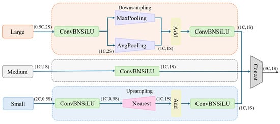 Figure 5 shows the structural principle of the TFE module. Before encoding features, a composite layer (ConvBNSiLU) is first applied for preprocessing to adjust feature channel number, aligning them with the main scale feature. For the Large feature map, we first use a convolutional module to unify the channel number to 1C. Subsequently, max pooling and average pooling are employed for downsampling, helping decrease the spatial dimension of features, thereby enhancing the robustness of the network to spatial changes and shifts of input images. For the Small feature map, we similarly adjust the channel number to 1C using a convolutional module. Secondly, nearest-neighbor interpolation is employed in upsampling to match the “Medium” feature map. This helps preserve local feature information and prevents small object feature loss. Lastly, the three feature maps of the same dimension are convolved and connected according to the following formula:
