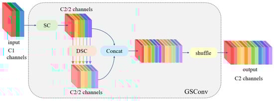 GSConv (Grouped Spatial Convolution) [44] is a lightweight convolution technique, aiming at reducing computation while maintaining sufficient precision. The GSConv principle is illustrated in Figure 7. First, we input the downsampled feature map of a standard convolution (SC), then Depth-Separable Convolution (DSC) is utilized to the output of the previous step. The results from these two steps are concatenated, and we finally use shuffling to infiltrate the features produced by SC into each section of the features produced by DSC. Shuffling represents an evenly mixed strategy. This approach facilitates the integration of SC information into the output of DSC through the uniform exchange of local features across different channels, and the entire process does not require cumbersome steps. Compared with traditional convolution techniques, GSConv significantly enhances the nonlinear representation of lightweight detectors by combining the Depth-Separable Convolution layer and a shuffle layer. This design strengthens the network’s ability to handle complex feature while keeping low computing requirements.