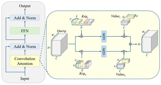 ConvFormer module (left) and the detail of convolutional attention (right). GDN denotes grouped double normalization. ⊗ denotes convolution operation, ⊕ denotes add.