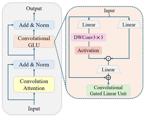 Convolutional GLU (ConvGLU) [46] is a channel mixer with gated channel attention that closes the gap between the GLU and SE mechanisms. It allows each token to gain channel attention based on its nearest neighbor image feature, which enhances local modeling capability and robustness. Figure 9 (right) depicts the structure of the CGLU. Nevertheless, the weight adjustment between channels in the CGLU is implicit and lacks the ability to model global context information. ConvFormer makes up for the deficiency. In addition, when keeping the parameter volume consistent with the Convolutional Feed-Forward (CFFN) module with an expansion ratio of R and a convolution kernel size of , the computational complexity of ConvGLU is , which is less than the of CFFN (Given an input ). Therefore, we integrate ConvFormer and the CGLU to achieve the attention of the channel mixer with less parameter and computational complexity, thus making the model more effectively extract global features.
