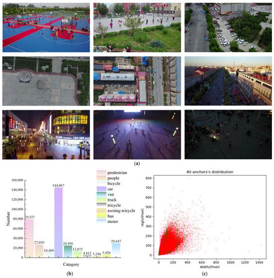 Figure 10 shows part of the images from the dataset (a), the count of tags (b) and the size of the tags (c). These figures illustrate the following characteristics and difficulties of the dataset in object detection and recognition. As illustrated in Figure 10a, the objects to be detected are numerous, small and easily confused. In the example scenario, it is difficult to distinguish between the pedestrian category and the people category. From the perspective of drone photography, the scale of objects varies greatly, and mutual occlusion is more pronounced, posing a great challenge to the performance of the object detection algorithm. Secondly, from Figure 10b, we can see that there is a significant difference in tag number among various categories. The tag number for the car category reached 144,867, while the awning–tricycle category was only 3246. The imbalanced examples among categories proposes higher requirements for the robustness of detection models. Finally, considering the size distribution of anchor points comprehensively, as illustrated in Figure 10c, in addition to the large number of large-size anchors in some categories, most anchors are within the range of 150 × 150 pixels, particularly the small objects, which are concentrated within the 50 × 50 pixel range. Therefore, this dataset puts forward higher requirements on the model’s ability for detecting small objects.