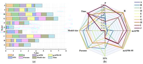In addition, Figure 11 intuitively presents the performance of each indicator of MSUD-YOLO and the comprehensive performance of the entire model. (All data in the figure are normalized. The closer the parameters of model size and time indexes are closer to 0, the better. The closer P, R, mAP50, mAP50-95 and FPS are to 1, the better.) A to J denote the ten models in Table 3, respectively. It is clear from Figure 11a that while the improved model integrating ASF and P2 boasts the most outstanding detection precision, it leaves room for enhancement regarding its parameters and model size. Model J proposed in this article demonstrates the most balanced performance results. In particular, the radar chart in Figure 11b illustrates that model J has the best overall performance.
