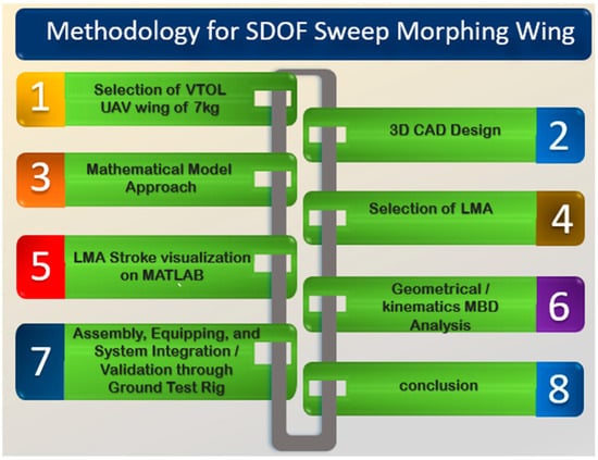 The wing morphing system described in this paper is applicable to both swept-forward and swept-back configurations. However, the swept-back is more favored due to its stability characteristics. The existing variable sweep or swing-wing technology has a maximum of three sweep angle settings, corresponding to the three regimes of the mission profile. However, the morphing mechanism allows the sweep angle to be set anywhere between −15° to +15°. The wing sweep can be dynamically controlled; therefore, it is not restricted to any one angle [2,3]. Bird flight inspires researchers to adopt mid-flight shape-changing technology to improve the aerodynamic characteristics of the wing. The current status of wing morphing concepts, designs, and technology, including flight testing issues and performance insights, is reported by Gomez and Ephrahim [4]. The history of wing morphing and important government-sponsored research projects are discussed along with recent technological advancements in the field [5]. Birds seamlessly change their wing shapes by slight to large margins, depending upon ambient conditions [6]. The morphing system in the present study was developed for utilization on the CSIR-NAL 7 kg eVTOL UAV. These UAVs face a drastic drop in lift generation during transition mode. To overcome this discrepancy, the wing can be morphed accordingly without altering the attitude of the aircraft. The review of morphing-related literature aids the understanding of the current technological status, problems, trade-offs, and methodologies used to attain wing morphing. Binbin Yan et al. [7] clarify the performance analysis of a wing geometry and dynamic model of the morphing aircraft. The aerodynamic parameters are analyzed to understand their variations during morphing operation. The aircraft behavior is predicted through simulation for various wing sweep configurations.