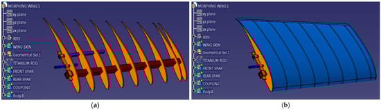 The 7 kg eVTOL UAV features wings with a total wingspan of 2000 mm and an effective wingspan of 1876 mm. The airfoil used for wing construction is the Selig 1210, a low-speed, low Reynolds number airfoil. The wing was constructed with nine ribs spaced equidistantly. The wing root chord is 362 mm, which tapers into a wing tip chord of 266 mm. The space segmented between the fuselage and wing is maintained at 100 mm to avoid interference during wing morphing. A novelty was introduced through the coupling of the front spar and the half-span rear spar through a single titanium rod, which acts as a centralized spar. The centralized spar bears the structural and aerodynamic loads without affecting the CG. The fuselage is 150 mm × 150 mm in dimension, providing adequate room for the robotic mechanism. The 3D CAD model of the wing is created using CATIA V5. The wing assembly featuring a centralized spar, having composite skin and skeleton variations, is depicted in Figure 2a,b.