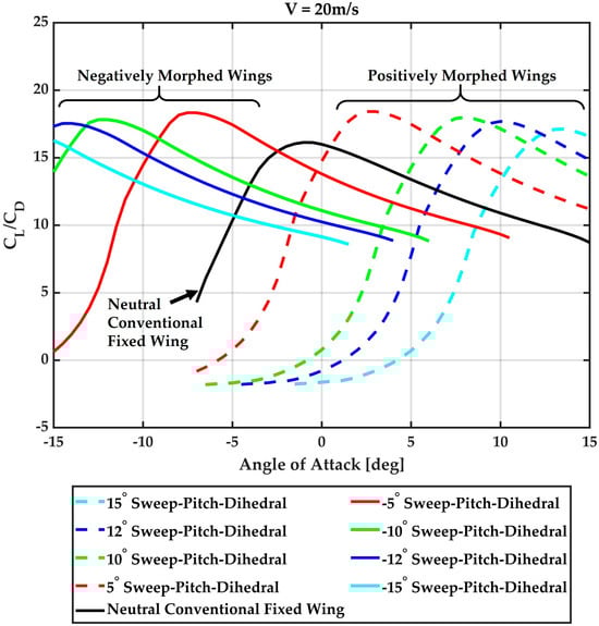 The wing aerodynamic characteristics have been computed for multi-mission morphed conditions. The combination of angle of attack (α), sweep angle (β), and dihedral angle (Ƴ) is considered to evaluate the lift coefficient (CL), drag coefficient (CD), and aerodynamic efficiency (CL/CD) in XFLR5 3D® using Vortex Lattice methods. The simulation was carried out for a 20 m/s velocity at 5.2 × 105 Reynolds numbers. It was observed, the CL/CD increases steadily up to 2.5 units of aerodynamic efficiency from 16.1 of conventional fixed wing to 18.6 for different morphed wing conditions within the range of ±15 degrees, which provided a gain of 15% improvement in aerodynamic efficiency. This optimization was achieved due to the elimination of horizontal and vertical tails, leading to reduced parasite and induced drag associated with the tails. The higher CL/CD and controllability are achieved through the combination of sweep–pitch–dihedral actuations. The results are tabulated in Table 1 and Figure 4. The optimized CL/CD was observed across the range of cruise-relevant angle of attack, thereby validating the benefits that morphing wing assembly can offer to trim the drag and enhance overall aerodynamic efficiency as compared to a conventional fixed wing.