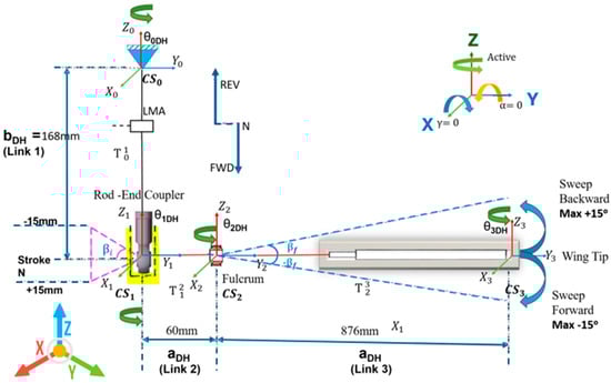 The kinematic analyses of a system are classified into forward and inverse kinematics [18]. The forward kinematic analysis of the sweep morphing mechanism provides the theoretical prediction of the system’s motion without considering external forces. The end position of the wing is determined using D-H parameters, while assuming that the system’s calibration is “one mm of LMA stroke achieves 1° wing travel in space”.