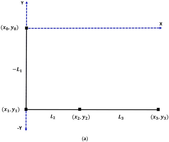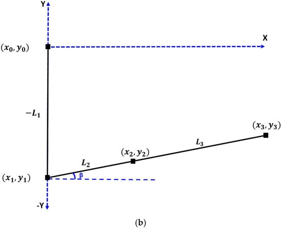 The coordinate system used to describe the sweep morphing system is the two-dimensional Cartesian coordinate system. The Cartesian frame encapsulates the top view of the SDOF sweep morphing system. To maintain the base of the sweep LMA at the origin, the fourth quadrant of the Cartesian frame is utilized. The morphing system is described using four major points to depict the base of the LMA, the fulcrum point, the point of the first rib, and the wing tip, respectively. The depiction of the sweep system in neutral configuration is shown in Figure 7a. In the neutral configuration, the coordinates of each point are obtained through direct measurement using known values of link lengths. The link L1, measures the distance between the LMA base hinge and the center of the rod end coupler. L1 is 168 mm at neutral or un-morphed condition. The second link L2 is 60 mm, portraying the distance between the fulcrum and the first wing rib. L2 remains constant through all morphed and un-morphed conditions. The final link L3, extends from the first wing rib to the wing tip (last wing rib), measuring 876 mm. L3 remains constant throughout the morphing operation. Within the sweep system, two parameters, L1 and β, are time-dependent. L1 is affected by the sweep LMA actuation, while ‘β’ denotes the sweep angle (Figure 7b). In contrast, L2 and L3 stay constant throughout the motion period. The point coordinates vary during the morphing operations. However, they can be obtained through straightforward trigonometry with careful consideration that the system lies in the fourth quadrant. The potential energy of the system is calculated based on its mounting height from the base of the fuselage (188 mm). The un-morphed, wing neutral position yields the following coordinates.
