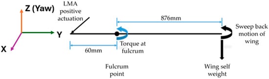 Apart from the static torque at the fulcrum, a simple calculation of actuator force is explained in Figure 8. To realize the static torque at the fulcrum required to hold the neutral sweep position of the wing, two major parameters of the system play a determining role. The weight of the wing assembly and the distance between the fulcrum and the wing tip (where the self-weight of the wing acts). Firstly, the mass of the wing assembly, along with the coupling components, is approximated at 1 kg. The weight of the wing is calculated for two cases: 1 g conditions for rest and level operation, and 3 g conditions for maximum possible load during flight. The second parameter, ‘lever arm’, is calculated from the fulcrum to the wing tip, which is measured to be 876 mm. The static torque is calculated using = m × g × l.