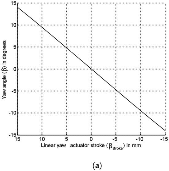 Wing sweep travel sweep angle (β) vs. LMA stroke (βs) in mm. (a) Backward yaw travel; (b) Forward yaw travel.