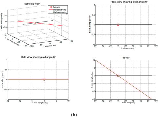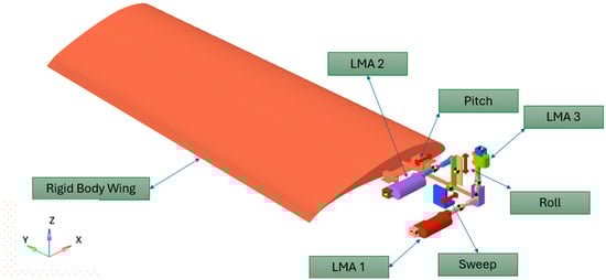The LH and RH wings are integrated with the fuselage through the centralized robotic coupling system. The coupling system is equipped at the fuselage CG position to achieve stable SDOF and multi-axis morphing. The sweep LMA is accommodated along with the roll and pitch LMAs at an inverted L position. It is placed at 90° from the roll LMA (roof-fixed), and parallel to the pitch LMA inside the fuselage. However, in a simulated ground test rig and mathematical modeling, the roll LMA is placed at the base of the fuselage. The conventional wing fixed assembly with tail and a tailless morphed wing assembly are differentiated in Figure 3a,b.