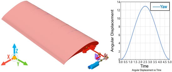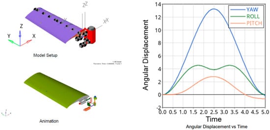 The MultiBody Dynamic model is made with the assumption of the wing being a rigid body. The SDOF sweep motion animation of ±15° is performed on Altair Motion Solve. The set-up with required constraints has been extracted from the multi-axis morphing assembly. The resultant time vs. angular displacement graph is shown in Figure 11. The wing is made with multiple rigid components and joints, both prismatic and revolute joints. For rigid body transformation, the authors have factored in scleronomic constraints, which are the results of position and direction vectors of the ball, hinge, universal, and rigid joints.