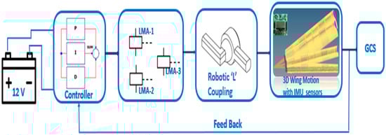 Figure 15 shows the control block diagram, explaining the control strategy adopted in the morphing experiment. Here, three LMAs are employed with linear PID controls to realize the 3D rigid body motions on the UAV wing. The power management system provides the LMA with 12 VDC at maximum current consumption of 1A for optimal operation. The LMA converts the applied voltage into linear motion, resulting in required wing travel in 3D space. The wing is fitted with an inertial measurement unit (IMU) and autopilot to simulate desired mission conditions and obtain accurate readings of angular displacement from the system. The LMA is capable of actuation at 3.5 mm per second, and the stroke was limited using PID controller to establish 1 mm travel at the rate of 0.0285 s over an operational range of 0 to 12VDC. The experimental tests may be monitored through GCS (Ground Control Station).