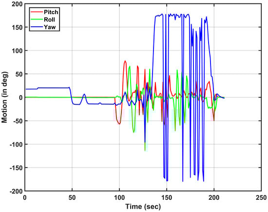 The experimental realization of forward sweep travel of 13° and backward sweep of 14.5° is observed. The pitch value is attained with positive and negative angles of attack of 12°, and the sweep attitude of −10° is achieved with a dihedral angle of 21° and an anhedral angle of −14°. Considering the initial offset value of actuator travel ±15 mm, the actual values fall at ±15° angular displacement. The backward and forward sweeps have been achieved with an acceptable range of percentage error between 0.8% to 1.5%, which validates the linear actuator motion of ±15° in terms of wing travel in the space. The ±15° travel is depicted in a scaled-up version of the graph in Figure 16. Thus, the robotic L coupling system achieved the multi-axis morphing wing travel to meet the mission requirements. The technical advantage of using the proposed mechanism is envisaged as follows:
