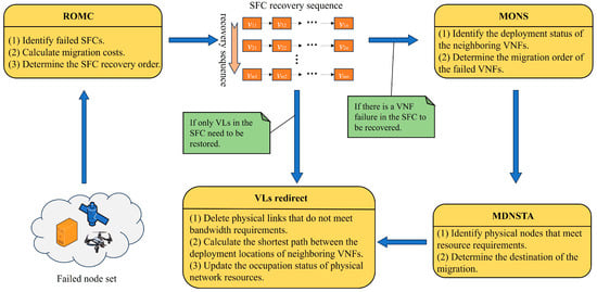 To address the above three issues, this paper proposes three targeted algorithms: the SFC recovery order algorithm based on migration cost (ROMC), the VNF migration order algorithm based on neighborhood states (MONS), and the migration destination node selection algorithm based on topology awareness (MDNSTA). These three algorithms collectively form the ERRRO method proposed in this paper, and the detailed implementation process is illustrated in Figure 2. When a resource node in the physical network is attacked and fails, the ROMC algorithm is first used to identify the SFCs requiring recovery and to determine their recovery order based on migration cost. For each SFC to be recovered, it is checked whether there exist VNFs that need to be restored. If so, the MONS algorithm is executed to determine the VNF migration order; otherwise, the failed VLs are directly redirected using the k-shortest path algorithm. For each VNF to be migrated in a failed SFC, the MDNSTA algorithm is run to determine the destination node for migration, followed by redirection of the failed VLs using the k-shortest path algorithm.