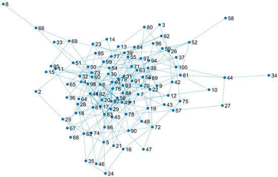 The simulation experiments were conducted using MATLAB R2024b. The experimental host is equipped with an Intel i9-13900HX CPU, an RTX 4060 GPU, and 16GB of RAM. A random connected network, named SubNetwork with 100 nodes, was generated to simulate the aeronautical information network. In the SubNetwork, each node is connected with a probability of 0.05, resulting in a total of 245 links. The network topology is illustrated in Figure 3. Within the SubNetwork, 40 nodes were randomly selected as cloud servers, 10 nodes as satellite platforms, 20 nodes as UAV platforms, and 30 nodes as wireless access points or switches. Links connected to satellite or UAV platforms are considered wireless links, while all other links are wired. A total of 1000 SFCs were generated and deployed in the SubNetwork according to the ESSFCD-DO method proposed in [12]. To ensure the availability of residual resources in the network for SFC recovery, each resource node was constrained with resource redundancy during the SFC deployment process. The resource redundancy level ε is defined as the ratio of the remaining available resources to the total resources at a resource node.