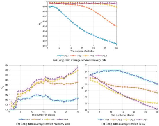 Figure 4a shows the long-term average service recovery rate Rs under different resource redundancy levels in the network. Firstly, it can be observed that Rs exhibits an overall decreasing trend as the number of attacks increases. This is because, as the number of failed nodes grows, the number of failed SFCs also increases, while the number of available destination nodes for the VNF migration decreases, thereby reducing the probability of successful SFC recovery. Secondly, Rs increases with the ε. This is because in networks with a larger ε, more node resources are available during the VNF migration, leading to a higher probability of successful SFC recovery. Finally, it can be seen that, in networks with different resource redundancy levels, the ERRRO maintains a recovery rate Rs above 0.91, demonstrating strong performance.