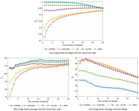 Figure 6a shows the long-term average service recovery rate Rs of the different SFC recovery methods. It can be observed that, before the number of attacks reaches 25, the ERRRO achieves the highest Rs, followed by the MRP, DLTSA, RT, and MJOVME successively. After the number of attacks exceeds 25, the Rs values of the ERRRO and MRP tend to converge. This is because the ERRRO prioritizes the recovery of the SFCs with the lowest recovery cost, and when selecting migration destinations for the VNFs, it uses topology awareness to prefer nodes with the greatest topological proximity. As a result, the migrated SFCs are more likely to meet delay constraints, thereby improving the probability of successful recovery. Additionally, it can be seen that the Rs values of the ERRRO, MRP, and DLTSA either decline or stabilize as the attacks increase, while those of the RT and MJOVME show an increasing trend. This is due to the fact that, in the early stages of attacks, a considerable number of failed SFCs in the RT and MJOVME can successfully execute the VNF migrations and the VL redirections but fail to meet the delay constraints, resulting in low recovery rates. However, this also causes most surviving SFCs to have relatively relaxed delay constraints, thereby increasing the likelihood of successful recovery in subsequent attacks.