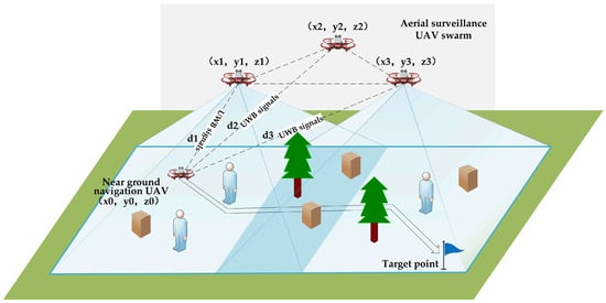 Considering the limitations of the fixed base station in the current UWB positioning methods, in order to meet the positioning requirements during the trajectory tracking of the near-ground navigation UAV, a cooperative positioning approach based on multi-UAV swarm UWB range perception is designed. The proposed method can obtain the position information of the near-ground navigation UAV in the environment in real time. Built upon the multi-UAV environmental modeling method described above, this approach supports the real-time positioning of the near-ground navigation UAV in the environment. Unlike the UWB positioning methods based on fixed base stations, the base stations in the positioning method proposed in this paper are not deployed on the ground at a certain location permanently. They are mounted on the aerial surveillance UAV swarm to form a group of mobile positioning base stations. Specifically, the aerial surveillance UAV swarm hovers above the environment in a known triangular formation. Among them, two UAVs perform global 3D environmental data modeling using the method described in Section 3.1. Together, all three UAVs serve as UWB positioning base stations, while the near-ground navigation UAV serves as the target tag. The real-time range measurements between the aerial surveillance UAV swarm and the near-ground navigation UAV are obtained by the onboard UWB devices. Based on the known positions of the aerial surveillance UAV swarm and the range measurements above, the system calculates the real-time position of the near-ground navigation UAV in the environment by using a trilateration algorithm. Thus, the position information of the near-ground navigation UAV is obtained in real time.