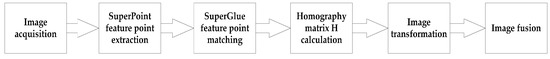 Step 1: Stitch the downward-facing camera images of the two aerial surveillance UAVs, which are hovering above the environment. The flowchart of the UAV image stitching algorithm is illustrated in Figure 4. Initially, the SuperPoint [36] and SuperGlue [37] networks are employed to extract and match feature points between the two UAV images, respectively. Subsequently, based on the matched feature point pairs, a homography matrix is computed to estimate the geometric transformation relationship between the two images. Finally, image transformation and fusion are performed using the homography matrix.