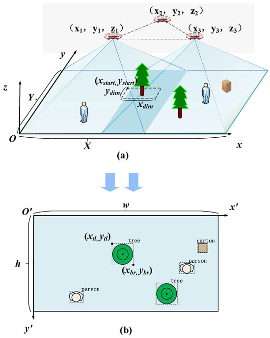 Step 3: Compute the real-world positions and dimensions of the obstacles in the environment according to the collected obstacle information. In this paper, the frame shown in Figure 5a is defined as the real-world environment model coordinate system. Its origin sits at the figure’s lower-left corner; the axis points right, and the axis points upward. This frame describes objects’ actual 3D positions. The pixel frame in Figure 5b, with origin at the upper-left corner, is defined as the screen (pixel) coordinate system. Here, the axis points right and the axis increases downward. This frame expresses the 2D pixel locations of objects in the stitched BEV image. According to the above correspondence, and also combining the stitched UAV image size with the height of the aerial surveillance UAV swarm, the pixel coordinates of the obstacle bounding boxes can be obtained. Let the stitched image have pixel width and height , and let the physical map dimensions be (m), determined by the UAV swarm altitude. We convert the bounding box top-left and bottom-right pixel coordinates as shown in Equations (1)–(4):