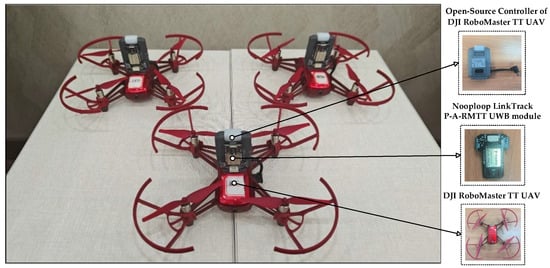In order to verify the effectiveness of the proposed method, two groups of experiments are conducted in real scenes, including UAV cooperative positioning and UAV autonomous navigation experiments based on air–ground collaboration. The experimental hardware comprises three main components: four DJI RoboMaster TT UAVs, four open-source controllers, and five Nooploop LinkTrack P-A-RMTT UWB sensors. Each UAV integrates a communication system, propulsion system, flight controller, vision-based localization system, and flight battery. Built-in features include infrared height hold, LED indicators, and Wi-Fi connectivity. The BEV camera offers a 320 × 240-pixel resolution. The open-source controller serves as an expansion module for the TT UAV. It attaches to the UAV’s micro-USB port via a micro-USB cable. Its extended I/O interfaces support the UART, I2C, GPIO, PWM, and SPI protocols. The UWB module connects to the controller through UART. In local positioning mode, the UWB achieves a maximum ranging rate of 50 Hz. This meets the real-time tracking demands of high-speed targets. See Figure 6.