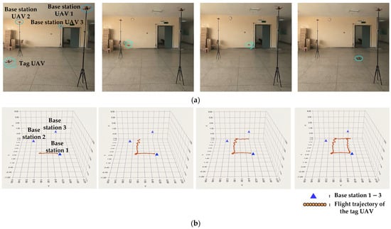 The experimental results are shown in Figure 8, in which Figure 8a illustrates the flight process of the tag UAV following a predefined rectangular trajectory, and Figure 8b shows the calculated position information (trajectory) of the tag UAV during the flight process. In Figure 8b, the three blue triangles represent the three base stations, corresponding to base station UAV 1, base station UAV 2, and base station UAV 3. The calibrated positions of the three base station UAVs are (0 m, 0 m, 0 m), (2.428 m, 2.356 m, 0 m), and (4.671 m, 0 m, 0 m), respectively. The orange curve represents the flight trajectory of the tag UAV. As can be seen from Figure 8, the proposed cooperative positioning method can calculate and update the position of the tag UAV during its flight process in real time through the multiple base station UAVs. Whether the tag UAV flies straight or turns, the cooperative positioning method can promptly respond to the change in the UAV position in time without an obvious positioning loss or data drift. The cooperative positioning result curve clearly reveals the rectangular flight trajectory of the tag UAV, and the system realizes real-time positioning throughout its flight. These results demonstrate the performance of the proposed cooperative positioning method and validate its feasibility and effectiveness in real-world environments.