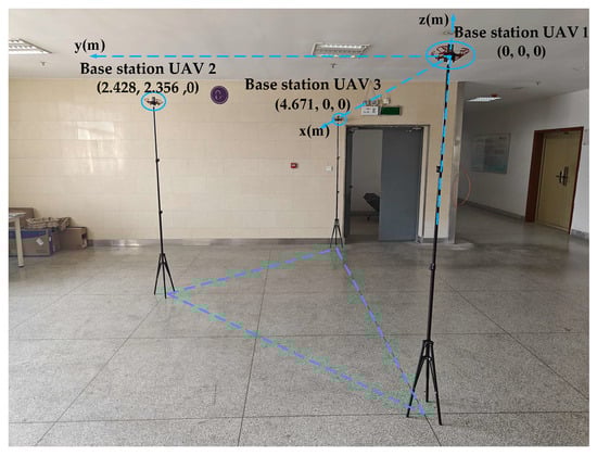 The purpose of this experiment is to verify the feasibility of the proposed cooperative positioning method and evaluate its positioning performance under ideal conditions. In the experiment, five UWB modules are configured to local positioning mode, of which three are installed on the three base station UAVs, one is installed on the tag UAV, and the other is installed on the ground control platform. The three base station UAVs are fixed at the same height with tripods and distributed in a triangular formation, as shown in Figure 7. This experimental scenario design enables the positioning system to ignore the cooperative control process of multiple base station UAVs and mitigates the hardware performance limitations of UAVs, allowing us to focus on evaluating the positioning performance of the cooperative positioning method. Each UWB module actively measures the distances between them and completes the automatic calibration of the base station positions. In the experiment, the tag UAV is controlled to fly along the rectangular trajectory marked in Figure 7, and the position information of the tag UAV is calculated in real time by the three base station UAVs through the proposed cooperative positioning algorithm.
