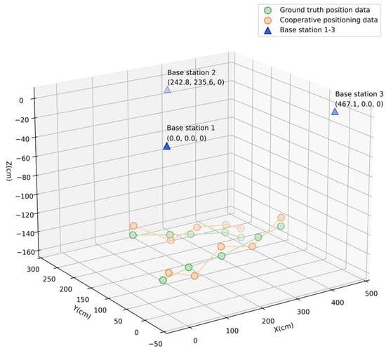 To further quantify the performance of the proposed mobile anchor trilateration method, we fix the aerial surveillance UAVs on tripods at a uniform altitude according to predefined geometric relationships. These UAVs jointly define a reference plane with its z-coordinate set to zero. Under this convention, any point below the plane has a negative z-value, and any point above has a positive z-value. This coordinate scheme clearly depicts the relative positions and spatial distribution of all UAVs, as shown in Figure 9. Then, the cooperative positioning data of the tag UAV from the three base station UAVs are recorded, while the ground truth positions of the tag UAV in the base station coordinate system are precisely measured. By comparing the cooperative positioning data with the ground truth position data, the positioning error of the cooperative positioning method can be calculated.