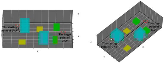 Figure 13 shows the constructed global 3D environmental data model based on UAV BEV image stitching and object detection, along with the UAV path planning results based on the environmental model. In the model, cubes of different sizes and colors represent various categories of obstacles in the environment. The total time for the global environmental data modeling process was 0.04 s. The white point represents the start position of the near-ground navigation UAV, and the black point represents the target of the near-ground navigation UAV, with target coordinates of (8 m, 2.3 m, 0.8 m). The black line represents the 3D path of the near-ground navigation UAV. The path planning process took a total of 0.019 s, with a path length of 6.41 m and a path planning speed of 1214 km/h. T The algorithm also added different-sized inflation areas to different environmental obstacles based on the TT UAV’s radius. This region is rendered as the light-colored area surrounding each cube in the figure.