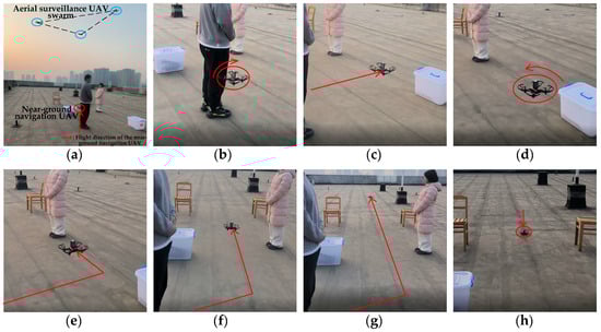 Flight trajectory tracking process of the near-ground navigation UAV. (a) The UAV takes off. (b) The UAV rotates clockwise. (c) The UAV moves straight. (d) The UAV rotates counterclockwise. (e) The UAV moves straight. (f) The UAV continues straight ahead. (g) The UAV arrives at the target point. (h) The UAV makes a landing.