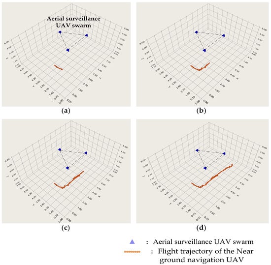 Cooperative positioning results during the flight trajectory tracking of the near-ground navigation UAV. (a) The UAV adjusts its heading orientation and moves straight after takeoff. (b) The UAV moves straight after rotating counterclockwise. (c) The UAV continues straight ahead. (d) The UAV arrives at the target point.