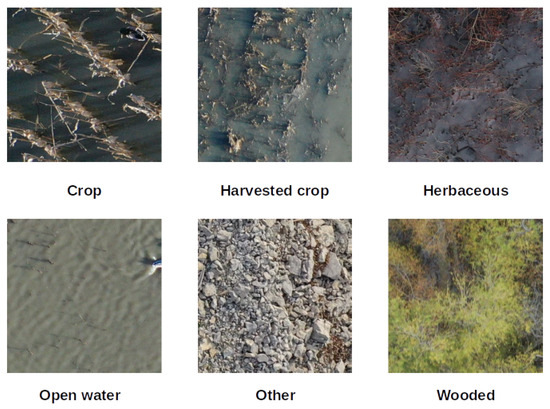 The drone imagery used in this study was collected between October and March during the 2021–2022 nonbreeding season for waterfowl across ten conservation areas in Missouri. Waterfowl were actively present at the survey sites during this period [5]. Flights were conducted in the morning hours, beginning no earlier than two hours after sunrise and ending by 1:00 p.m., to ensure adequate lighting and minimize behavioral disturbance to the birds [5]. To account for variation in environmental conditions, images were collected across different altitudes (15–90 m), habitat types (e.g., open water, moist-soil, and flooded crop fields), and sky conditions (sunny and cloudy) [9]. This design allowed us to test model performance under realistic survey conditions. Previous research has shown that lighting, vegetation cover, and survey altitude can significantly influence both image quality and waterfowl detectability [5]. For instance, flight speeds were reduced at lower altitudes to avoid motion blur, and survey periods were spaced to avoid overlap with potential disturbances (e.g., helicopter flights), based on UAS behavior protocols outlined in [5]. Therefore, our dataset captures representative and operationally relevant imagery that reflects the temporal and environmental variability typical of wildlife monitoring scenarios. Each image was manually annotated for three key aspects: waterfowl detection, habitat segmentation, and overlapping region identification. For waterfowl detection, birds were labeled with bounding boxes using Labelme 5.2.1 software, and annotations were reviewed by experts to ensure accuracy. Habitat segmentation was performed by categorizing images into six habitat types: open water, cropland, harvested crop, wooded, herbaceous, and other, as shown in Figure 1. To facilitate model training and evaluation, the dataset was split into training (80%), validation (10%), and test (10%) sets. The training set was used to fine-tune deep learning models for habitat classification, while the validation set helped with hyperparameter tuning. While this ensures that the test set images were not used during training, the splits were conducted within each dataset collected from the same conservation areas and seasons. Therefore, the training and test sets are not strictly independent in terms of spatial or temporal domains. Future work will include validation using independent datasets collected from different regions and seasons.
