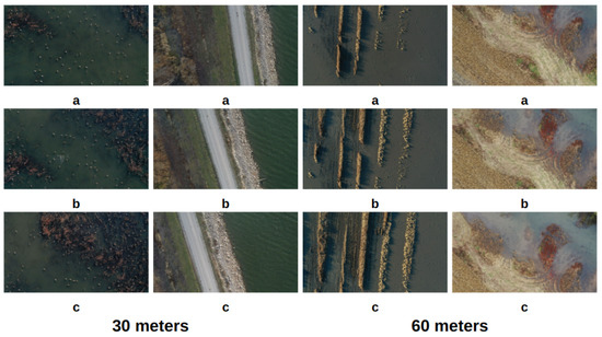Examples of the test image sequences used in our experiments. Each sequence contains three consecutive images captured along a drone flight path. The letters (a–c) denote the temporal order of image capture within each sequence. Left: two image sequences captured at an altitude of 30 m; right: two image sequences captured at an altitude of 60 m.