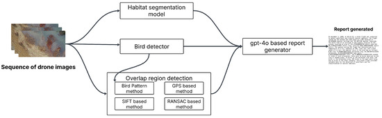 Architecture of our proposed system for identification of waterfowl populations in their habitats using deep learning and LLMs based on sequences of overlapped drone images. The system processes a sequence of aerial images with overlaps by applying a habitat segmentation model to classify different habitat regions and a bird detector to localize waterfowl. To prevent double-counting of waterfowl and habitats, the overlap region detection module incorporates multiple methods, including GPS-based, SIFT-based, RANSAC-based, and bird-location-based approaches. Notably, the bird-location-based method requires bird detection results as one of its inputs to accurately identify overlapping regions in consecutive images. The extracted information is then compiled by a GPT-4o-based report generator, producing automated summaries of waterfowl distributions in different habitats.