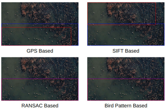In addition, the GPS- and bird-location-based methods ran very fast, in seconds, whereas the SIFT-based and RANSAC-based methods are much slower, one to two orders of magnitudes slower. This increase in execution time for both the SIFT and RANSAC methods for 60 m images compared to 30 m images is due to the greater complexity and content volume in the images at higher altitude. Overall, the bird-location-based method is the most effective approach considering both speed and accuracy for both 30 m and 60 m situations.