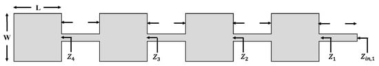 Using the transmission line Equation (6), this load impedance was successively transformed step by step back toward the first feed point. Based on the configuration shown in Figure 2, where identical patch elements are employed, the approximated impedance at each stage can be expressed as follows:
