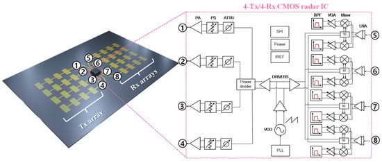 The 24 GHz 4Tx and 4Rx CMOS IC is integrated with the series-fed array antennas, as shown in Figure 3. Each Tx chain consists of a power amplifier (PA), phase shifter, and attenuator, enabling beam steering by adjusting the relative phase shift among each chain. On the Rx side, each chain includes a low-noise amplifier (LNA), mixer, transimpedance amplifier (TIA), programmable baseband gain amplifier, and a band-pass filter (BPF). In addition, a phase-locked loop (PLL) and a voltage-controlled oscillator (VCO) are integrated to support frequency-modulated continuous wave (FMCW) operation. Since the 24 GHz CMOS radar IC has already been validated in [31], a detailed analysis of the IC itself is not included in this paper.