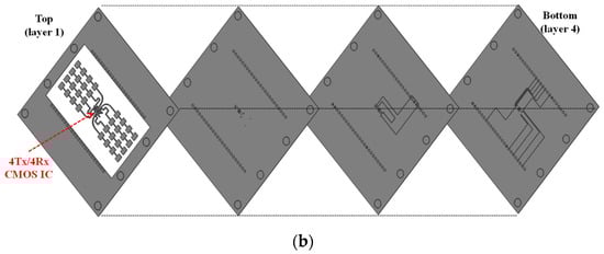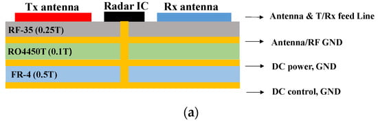Figure 4a illustrates the multilayer PCB configuration of the proposed radar module, while Figure 4b presents the detailed layer structure. By adopting series-fed array antennas, the design enables coplanar integration of the antenna array and radar IC on a single PCB layer, eliminating the need for antenna feed vias and avoiding the repeated use of expensive low-loss substrate materials. Low-cost FR-4 substrates are employed beneath the antenna’s ground plane within the multilayer PCB stack, effectively reducing both the overall system cost and manufacturing complexity. The relative permittivity of RF-35, RO4450T, and FR-4 are approximately 3.5, 3.5, and 4.3, respectively, while their corresponding loss tangents are about 0.0025, 0.004, and 0.018, respectively.