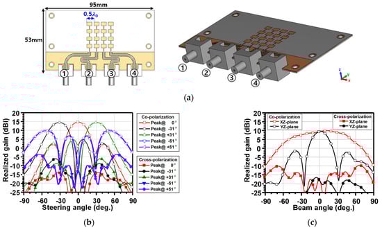 Figure 6a illustrates the simulated structure and radiation characteristics of the proposed series-fed antenna array. The array consists of 16 patch elements arranged in a 4 × 4 matrix, with a uniform sub-array spacing of 0.5 λ0. The structure is excited through four independent feed ports, each corresponding to one row of the sub-array, enabling beam steering control via port selection and the excitation phase. As shown in Figure 6b, when all four ports are excited with appropriate amplitude and phase control for the transmitting radiation pattern, successful beam steering is achieved in the XZ-plane. The simulated main beam scanning range covers approximately 91° while maintaining side-lobe levels (SLL) below −10 dB. A peak realized gain of 14.8 dBi is achieved within the scanning range. The co-polarization patterns exhibit a high gain in the intended directions, while the cross-polarization levels remain below −15 dB across the scanned angles, indicating excellent cross-polarization discrimination (XPD). Additionally, Figure 6c shows the radiation performance when only port 1 is excited, representing an Rx radiation pattern. In this case, the HPBW in the XZ-plane is approximately 90°, with realized gains of 10 dBi on the XZ-plane and 9.5 dBi on the YZ-plane. Overall, the simulation results validate the effectiveness of the proposed multilayer PCB-integrated series-fed antenna in achieving high-gain, steerable radiation patterns suitable for radar beamforming while maintaining structural compactness and low implementation complexity.