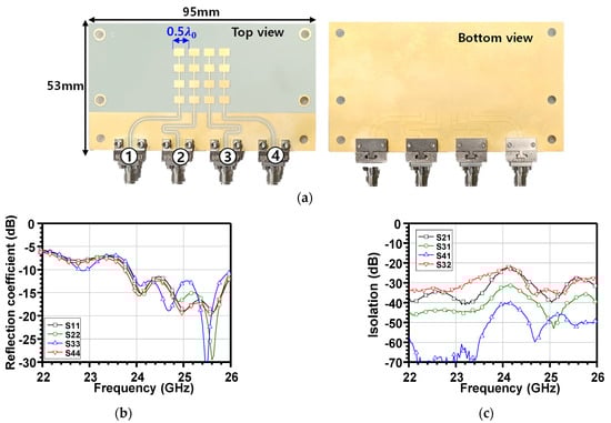 Figure 7. Implementation of the series-fed array antenna with (a) top and bottom views, measured (b) reflection coefficients, and (c) isolation among each port.