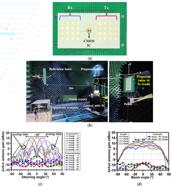 The complete radar system was implemented, as shown in Figure 8a. The antenna was fabricated on a multilayer PCB and integrated with the radar transceiver IC using chip-on-board (COB) bonding. The radiation characteristics of the fully assembled radar module were then measured in a millimeter-wave (mmWave) anechoic chamber, as depicted in Figure 8b. The measured Tx beam steering patterns, obtained through analog beamforming, demonstrated a peak gain of approximately 15 dBi. The 3 dB beam scanning range covered ±45° in the XZ-plane; beyond this range, grating lobes emerged, making those angles unsuitable for radar operation. Additionally, the radiation pattern of a single sub-array was measured, as shown in Figure 8d, to indirectly assess the received (Rx) radiation characteristics. The average measured HPBW in the XZ-plane was approximately 80°, confirming the Rx array’s suitability for target detection in short-range radar applications.