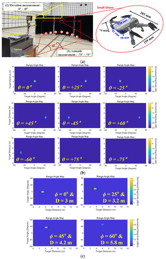 Figure 9. Drone detection test with (a) measurement description, (b) measured azimuth direction profile, and (c) measured elevation direction profile results.