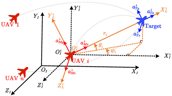 where is the relative range between UAV i and the target; and are the elevation angle and the azimuth angle of the LOS with respect to , respectively; and and are the components of the acceleration of UAV i and the target in , respectively.