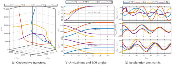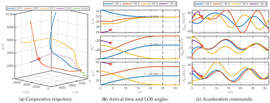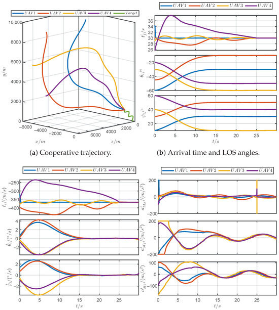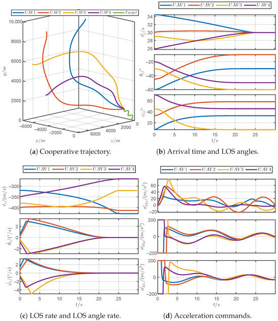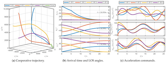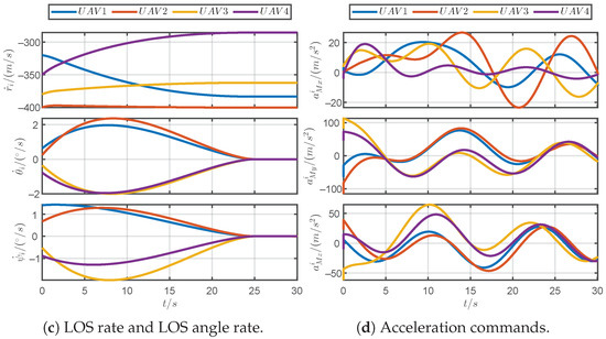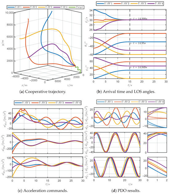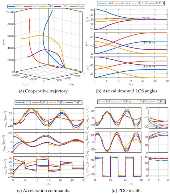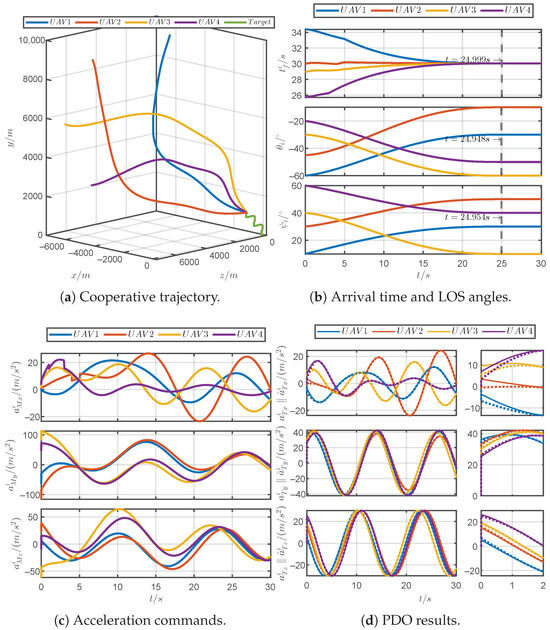Figure 13 shows the simulation results of the proposed guidance law for a discontinuous maneuvering target. Figure 13a demonstrates that the PRCG law can guide four UAVs to simultaneously approach the discontinuous maneuvering target. As shown in Figure 13b, it can be observed that the arrival times and the LOS angles can converge within the prescribed time 25 s. As shown in Figure 13c, the acceleration commands for the UAVs consistently remained within the tolerable acceleration limits, and the commands incurred jumps due to the discontinuous maneuvers of the target. Figure 13d reveals that the PDOs could accurately estimate the acceleration of the discontinuous maneuvering target. In brief, the PRCG law can adapt to unpredictable target maneuvers.