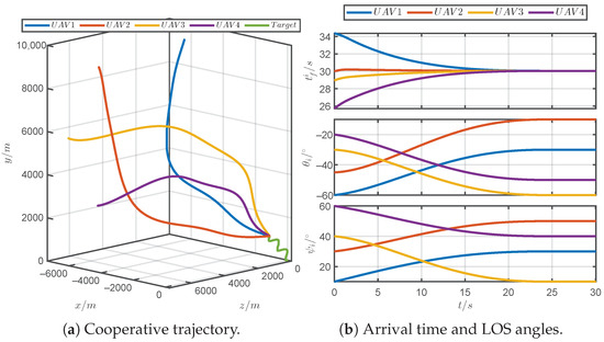 Detailed information of the PTCG law can be found in [33]. As shown in Figure 9, UAV 1 was designated as the leader for the PTCG law. The desired arrival time of the leader was configured to be 30 s, i.e., . The prescribed settling time of the PTCG law was configured as 25 s, i.e., . Other parameter configurations were consistent with those in the first subsection of the numerical simulation in [33].
