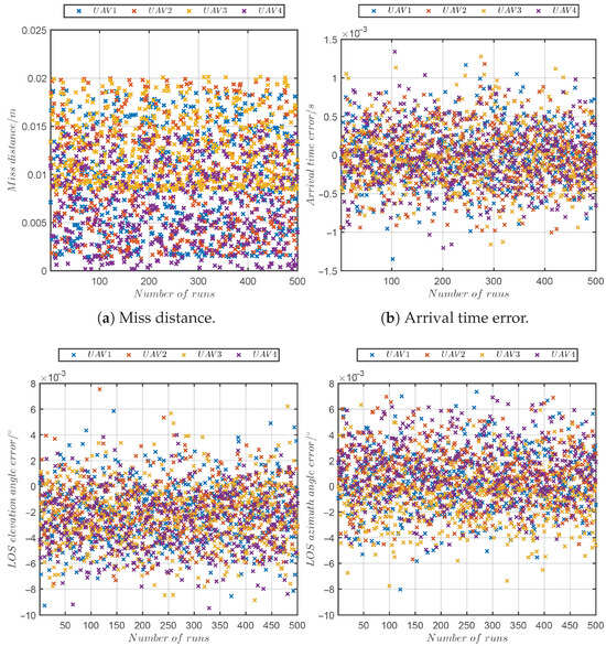 This subsection will perform Monte Carlo simulation to further validate the robustness of the PRCG law against navigation errors and noises. The initial position errors of the UAVs were configured to follow a uniform distribution over m, and the initial LOS angle errors were configured to follow a uniform distribution over . The LOS angle measurement noises were configured to follow a zero-mean Gaussian distribution with a standard deviation of . The other parameters remained consistent with those in Case 2. Monte Carlo simulation was performed 500 times under random initial conditions.