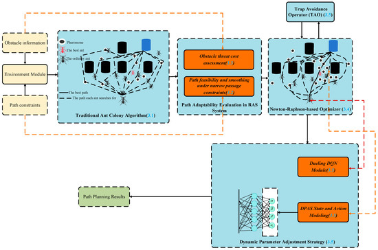 To overcome RAS-specific challenges, a hybrid NRBO-ACO path planning algorithm is proposed, as illustrated in Figure 3. The framework combines environmental threat assessment, narrow passage constraints, and path feasibility evaluation with a Newton-Raphson-based optimiser (NRBO) for local refinement. The dueling DQN module dynamically adjusts ACO parameters to improve convergence. TAO is used to escape local minima, and the final path is selected from all ant-generated candidates based on adaptability in the RAS system.
