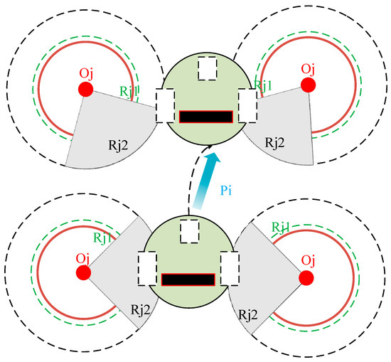 As illustrated in Figure 4, the red circles denote the fish tanks, while the green and black circles indicate the next-level and subsequent-level cost zones, respectively, with the cost decreasing progressively. Rj1 and Rj2 represent the distances from the center of the fish tanks to the green and black circles, respectively. When a path node enters the influence radius of a fish tank, the threat cost increases, prompting the path to steer away from the edges of the fish tanks. This mechanism effectively minimizes the risk of collisions.