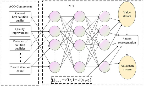 In contrast, our approach adopts a model-guided adaptation mechanism, where the dueling DQN is not responsible for generating actions directly but rather adapts the internal parameters of the ACO optimiser in real time. This structural decoupling leads to the following: